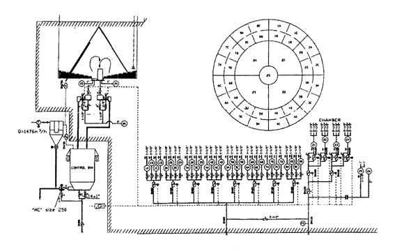 它的均化機理是生料粉由庫頂生料分配器通過8條卸料斜槽,在庫頂成徑向分布,不同時間的生料在不同的料層上具有徑向均化的效果,庫底充氣系統設計呈放射狀斜向分布,更符合生料粉的流動傾向。環形區一般分為8個充氣單元區,可每隔5-10分鐘循環一次,環形區的生料因松動及氣流的引導流向中心區,庫內的卸料過程是成柱狀流動切割水平面料層的生料粉,讓不同時間的生料粉進入中心區,由于中心區的充氣強度大,不同時間的生料粉進入中心區后得到充分的攪拌,從而達到理想的均化效果。功率消耗0.1-0.3kW/t,具有較高的均化比。