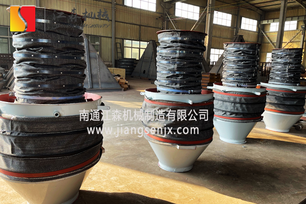 ※伸縮節特點:伸縮節分為內外兩層(內層卸料,外層收塵),伸縮節的升降采用3根繩索來拉動,如左圖所示,通過鋼絲繩的拉力,可防止在收塵過程中由于收塵的負壓使外層布袋被吸癟的缺點,從而保證了伸縮節之間的收塵通道通暢,又增強了伸縮節的使用壽命。外層使用防雨帆布。